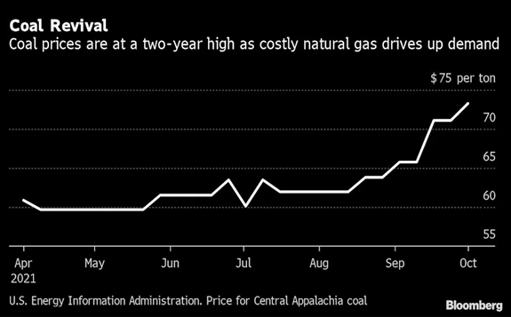 Coal from the central Appalachia region rose $2.20 to $73.25 a ton for the week ending Oct. 1, according to government data released Monday. That’s up 35% from the start of the year and the highest since May 2019. Prices in other regions are lower but are following the same upward path.