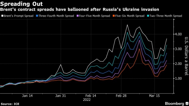 Brent’s so-called prompt spread -- the differential between its two nearest contracts -- expanded to $3.70 a barrel in backwardation on Monday. That’s up from $2.86 a barrel on Friday, and 41 cents at the start of the year.