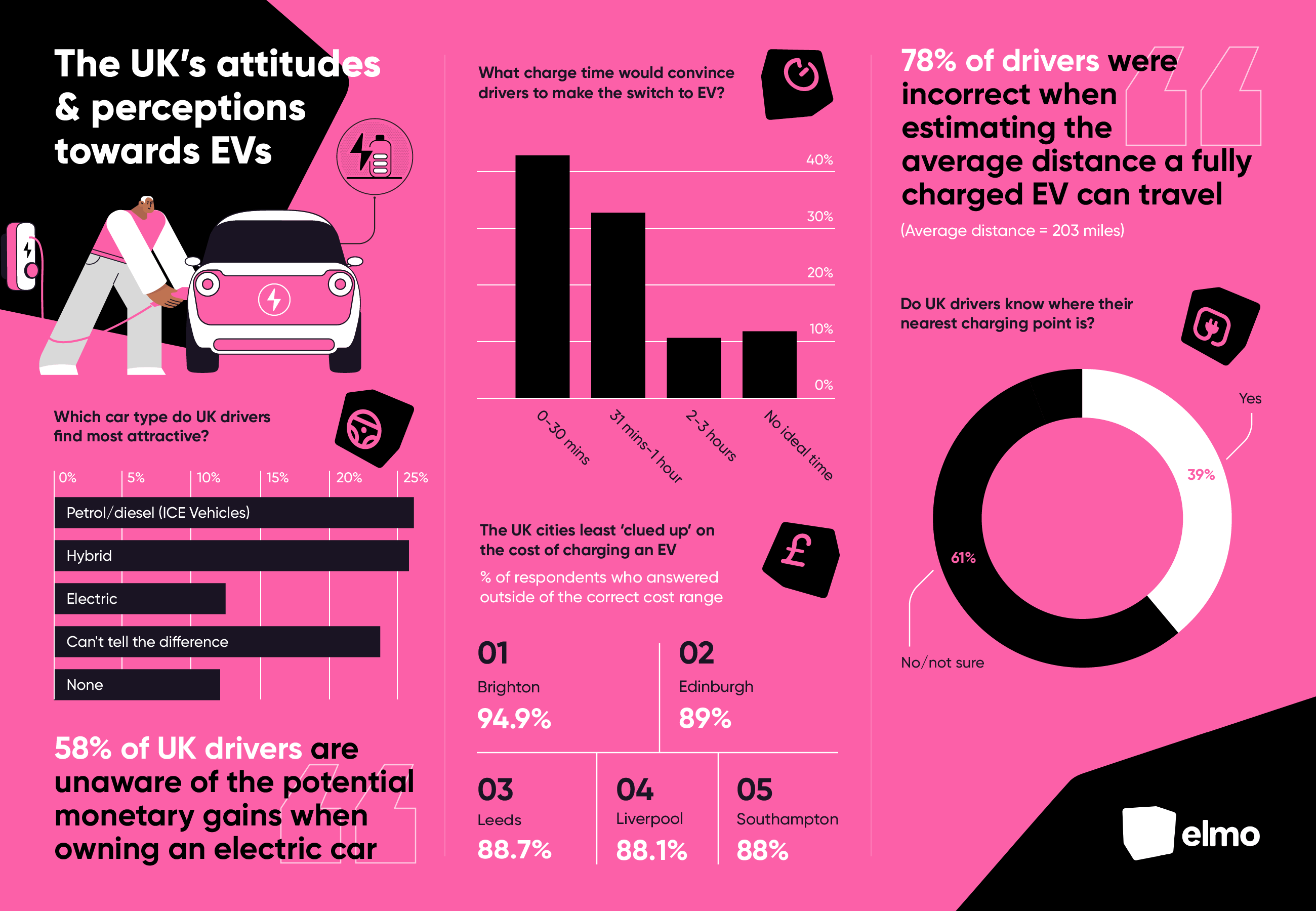Olly Jones, co-founder of elmo, said it is interesting to see that the two biggest barriers putting off everyday motorists from switching to an electric car are the upfront cost of buying an EV and the lack of awareness about charging - the location of chargers, time to charge and potential cost savings.