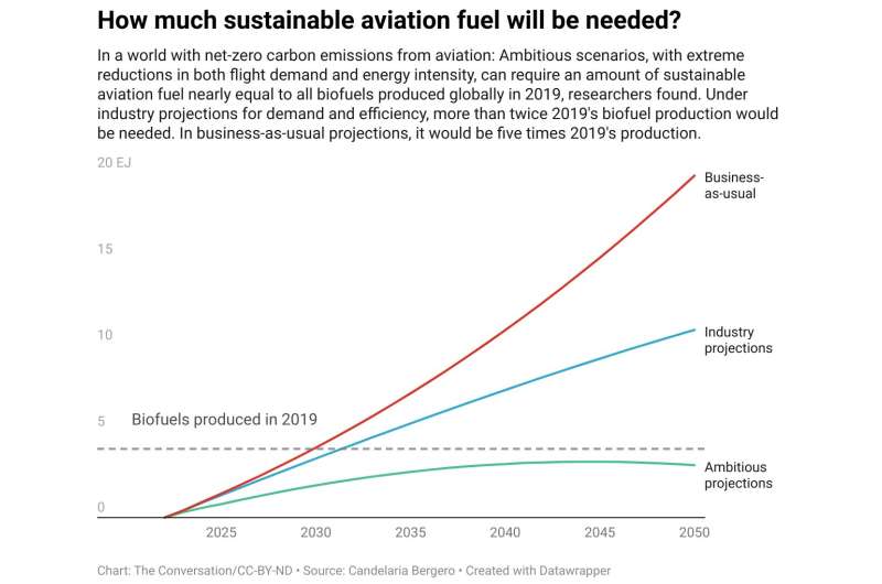 Several major airlines have pledged to reach net-zero carbon emissions by midcentury to fight climate change. It's an ambitious goal that will require an enormous ramp-up in sustainable aviation fuels, but that alone won't be enough, our latest research shows.The idea of jetliners running solely on fuel made from used cooking oil from restaurants or corn stalks might seem futuristic, but it's not that far away.
