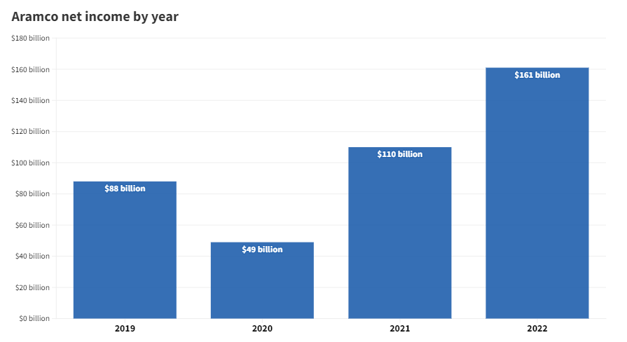 Saudi Aramco, the world's largest oil-exporting company, said annual net profit surged 46 per cent in 2022, driven by higher oil prices.