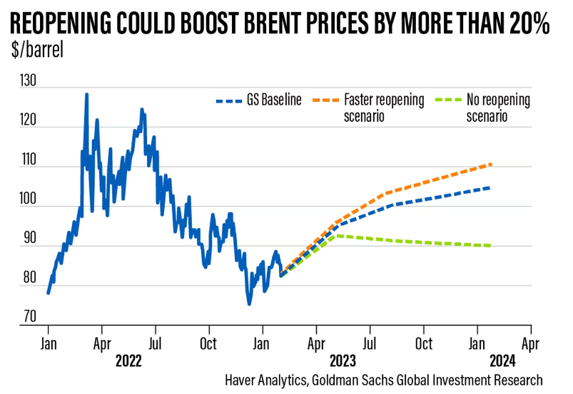 But China, the world's biggest energy importer, has reopened its economy and a full recovery in the country's domestic demand may raise global gross domestic product by about one per cent in 2023 and lead to a rally in oil prices, Goldman Sachs said in a separate report last month.