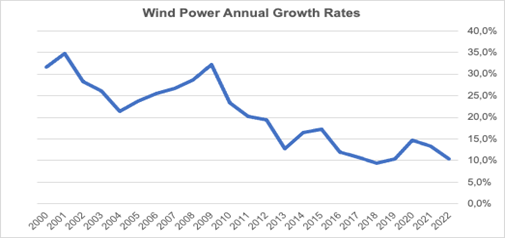 Delays across the globe result in the lowest growth since 2019. 88,6 Gigawatt of additional capacity added in 2022, equaling a growth rate of 10,5%, after 13,4% in 2021. Global wind power capacity stands at 934 Gigawatt – 1000 Gigawatt expected to be exceeded in 2023.