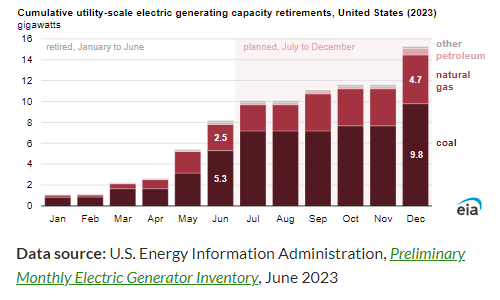 Retired capacity: Of the 15.3 GW of electric generating capacity that U.S. operators plan to retire in 2023, more than half (8.2 GW) was retired in the first half of the year. According to operator plans, coal-fired power plants will account for 64% of the retirements by the end of the year, followed by natural gas (30%). In 2023, operators expect 9.8 GW of coal-fired capacity to retire, 5% of the U.S. coal-fired capacity that was operating at the start of the year.