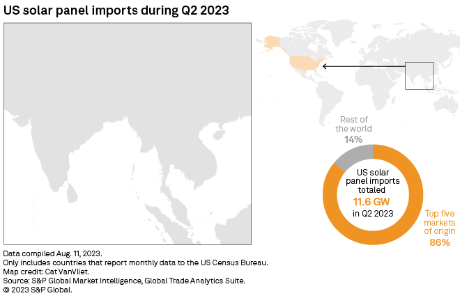 The total 24.6 GW of solar panel imports in the first half of 2023 compare with S&P Global Commodity Insights’ forecast of nearly 36 GW of installed US solar capacity this year. The country’s solar panel production capacity could reach 25.7 GW by the end of 2023, based on domestic manufacturing announcements tracked by Commodity Insights, up from 14.4 GW at the end of 2022.