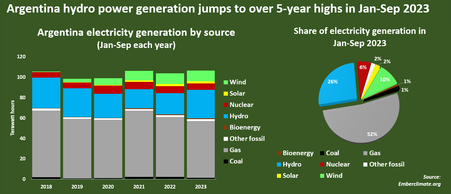 Argentina's hydro power generation through September totalled 28 terawatt hours (TWh), which marked a 36% jump from the same period in 2022 and the highest cumulative tally for that period since 2018, Ember data shows.