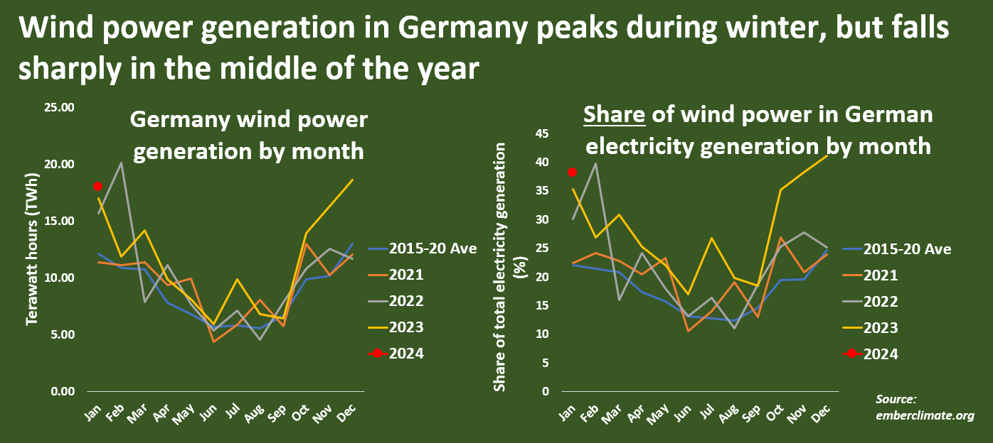 Wind power generation in Germany peaks during winter, but falls sharply in the middle of the year