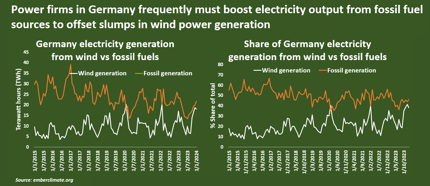 Power firms in Germany frequently must boost electricity output from fossil fuel sources to offset slumps in wind power generation