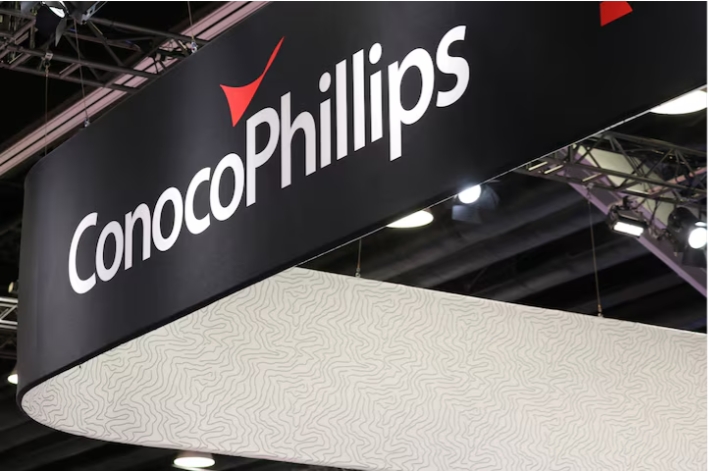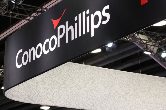The logo of American oil and natural gas exploration and production company ConocoPhillips is seen during the LNG 2023 energy trade show in Vancouver, British C…