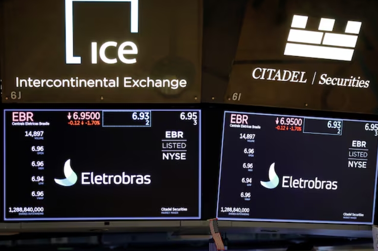 Logos of Eletrobras, a hydroelectric power generation company based in Brazil, is seen on the floor at the New York Stock Exchange (NYSE) in Manhattan, New York…
