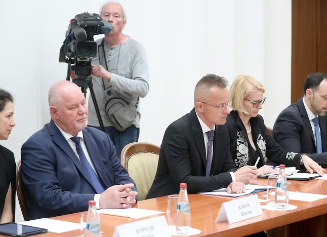 Members of the Hungarian delegation, led by Foreign Minister Peter Szijjarto, attend a meeting with Belarusian Foreign Minister Sergei Aleinik in Minsk, Belarus…