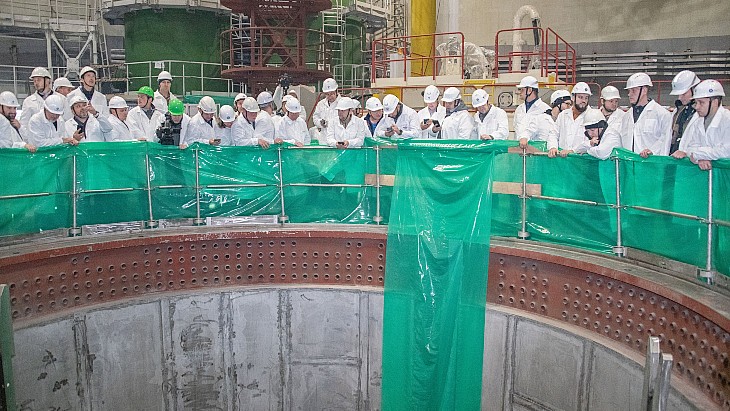 A crane with a lifting capacity of 600 tons was used to install the 11-metre high VVER-TOI reactor vessel in position inside a special support ring.