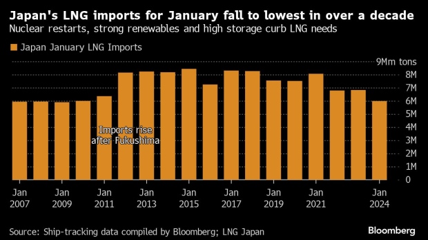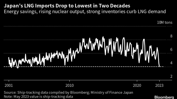 Source: Ship-tracking data compiled by Bloomberg; Ministry of Finance Japan(Bloomberg) -- Japan’s liquefied natural gas imports last month fell to the low…