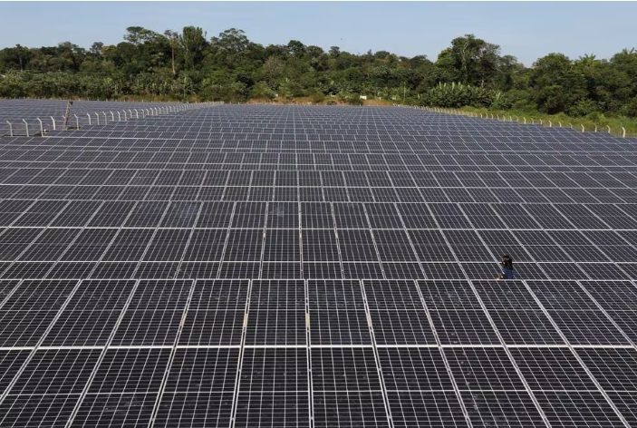 An employee works among solar panels of Bemol Solar plant outside Manaus, Amazonas state, Brazil August 23, 2021. Picture taken August 23, 2021. REUTERS/Bruno K…